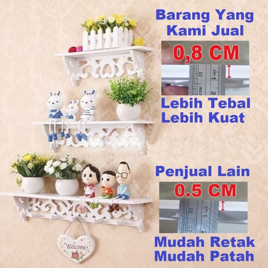 Rak dinding vintage 1set isi 3pcs (New ada 5 hook gantungan )Ready warna putihTIDAK TERMASUK PATUNG PAJANGANPanduan pemasangan ada di foko ke duaMaterial : WPCapa itu wpc? Wpc adalah kepanjangan dari wood plastic composite, yang secara bahasa dapat diartikan komposit kayu-plastik. Composite bisa diartikan campuran, jadi wpc adalah campuran antara kayu dan plastik. Sebuah material baru yang tersusun dari elemen kayu dan plastik yang dilebur menjadi satu dan membentuk sebuah material baru, wpc.Size produk ada pada foto produk nya yaMaterial
