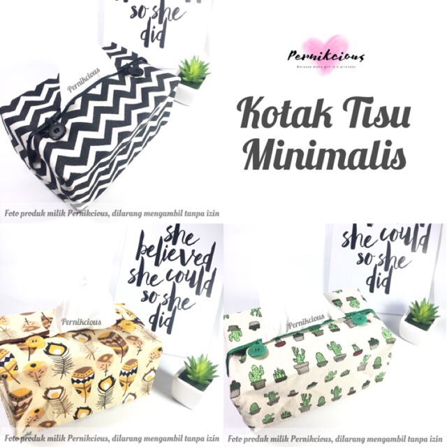 Hi, welcome to Pernikcious Please read the description Note :100% ORIGINAL product, kami tidak menjual produk KW ataupun yang sejenisnyaSilakan langsung checkout karena status barang adalah READY STOCK dan selalu diupdate jika habisBukan produk PO / dropship, setelah order produk langsung diproses kirimMasa pengemasan kurang lebih 24 jam (Tidak termasuk weekend dan tanggal merah), pengiriman yang lama saat di ekspedisi diluar kuasa kamiWeekend akan tetap ada pengiriman hanya JIKA MEMUNGKINKANSemua barang sudah dicek bagus dan dikemas seaman mungkin, kerusakan yang timbul akibat proses pengiriman oleh kurir silakan ajukan komplain ke pihak ekspedisiSegera konfirmasi terima produk setelah pesanan diterima dengan baik dan memberikan ulasan yang positifBila ada masalah segera menghubungi seller via chatMEMBELI = SETUJUThanks Harap segera konfirmasi pembayaran setelah checkout ya Dear agar pesanan kamu bisa segera kami proses. Thank you and happy shopping, Princess! ✨With Love,Pernikcious ======================COVER TISU MINIMALISDetail :Tempat tisu ini bukan hanya fungsional tapi juga artistik. Desain interior ruangan minimalis sangat cocok bila diberi sentuhan printilan dengan motif dan warna yang eye-catching seperti ini, it will pop the room out Tissue cover minimalis ini di produksi sendiri oleh Pernikcious dengan bahan berkualitas bagus tebal, muat untuk tisu isi 250 sheets, berbeda dengan tempat tisu pada umumnya yang bila dimasukkan tisu baru sempit dan terlihat menggembung namun bila stok tisu didalamnya menipis terlihat flat, tempat tisu kami akan tetap berbentuk meskipun tisu didalamnya tinggal sedikit dan alhamdulillah dibuat oleh penjahit profesional sehingga menghasilkan detail jahitan yang rapi serta tidak asal-asalan. Ukurannya yang tidak terlalu besar dan tidak terlalu kecil membuatnya pas menjadi dekorasi ruangan yang fungsional. Cocok untuk diletakkan dimeja atau dimobil, selalu kece dimanapun ia berada ❤️Spesifikasi :1x Tissue cover motif minimalis, pilih motif yang diinginkan saat memasukkan produk ke keranjangPerawatan :Jika hanya kotor sedikit lap dengan tisu basah atau kain yang sudah dibasahi air bersih.Jika ingin dicuci keseluruhan cukup direndam dalam air sabun dan sikat lembut bagian yang kotor, bilas lalu j